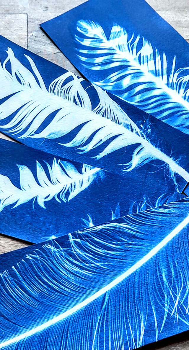 Die gelernte Buchbinderin praktiziert seit 2021 die Cyanotypie, ein altes fotografisches Edeldruckverfahren. Sie bereitet das lichtempfindliche Papier selbst zu und erhält so qualitativ hochwertige Monoprints in einem intensiven Blauton. Ob Pflanzen, Gegenstände oder auch „Reizwörter“ – Heike Kremer macht einfach blau.