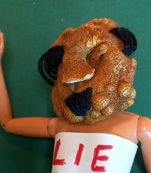Seit 2013 fertig sie kleine Plastiken aus getrockneten Lebensmitteln und Fundstücken. Ihre Gesichter aus Zitrusschalen erhalten beim Trocknen oft einen überraschenden Ausdruck und lösen unterschiedliche Emotionen aus – ganz nach ihrem Motto: „Die Ambivalenz der Dinge macht ihren Reiz aus.“ Was lag also näher, diese „Citruswicken“ (Zitronenköpfe) mit den ebenso ambivalenten „Reizwörtern“ zu verbinden? Welch ein Spaß!
