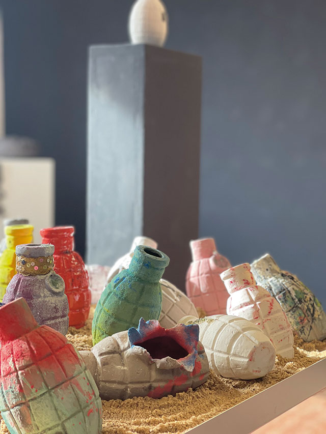 Spannend und politisch wird es auf jeden Fall im Galeriewohnzimmer, soviel sei verraten. Es gibt Granaten, einen Steigbügelhalter, einen roten, skelettierten Reifrock und vieles mehr. In der „Galerie der Reizwörter“ sammeln die Akteurinnen die Triggerwords und stellen ihnen eine Entschärfung gegenüber. Die vier beteiligten Künstlerinnen haben höchst unterschiedliche Ansätze und Betrachtungsweisen, arbeiten mit unterschiedlichen Materialien und sind doch friedlich vereint im Galeriewohnzimmer.